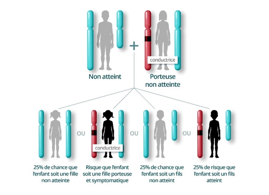 Le terme « dominante lié à l’X » signifie que chez une femme, la présence d’un seul chromosome X porteur de la variation pathogène suffit à entrainer des symptômes, avec une expression parfois variable en raison d’un phénomène d’inactivation du chromosome X. Les femmes atteintes auront 50% de risque de transmettre la variation génétique à leur descendance. Chez un homme, la présence d’un chromosome X porteur d’un variant pathogène entraine généralement une atteinte plus marquée, car il ne dispose pas d’un second chromosome X sain pour compenser. Les hommes atteints transmettront la variation génétique à toutes leurs filles, et à aucun de leurs fils.