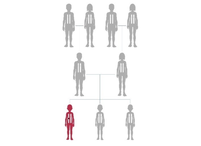 Dans la grande majorité des cas, il s’agit d’une anomalie génétique « de novo ». Cela signifie que ni la mère, ni le père ne sont porteurs de cette anomalie et qu’elle est apparue accidentellement, probablement lors de la formation de l’ovocyte ou du spermatozoïde qui ont permis la naissance de l’enfant.